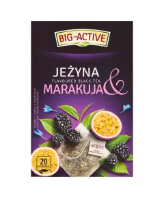 Dane produktowe Big-Active Herbata czarna jeżyna & marakuja 40 g (20 x 2 g) Jeżyna i marakuja + czarna herbata + płatki bławatka = wyjątkowy smak Każdą naszą torebkę zapakowaliśmy w kopertkę, która jest gwarancją utrzymania smaku i aromatu. Składniki: herbata czarna (70 %), owoc dzikiej...