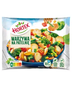 Dane produktowe Hortex Warzywa na patelnię 450 g Składniki: warzywa w zmiennych proporcjach: brokuły, ziemniaki podsmażane (ziemniaki, olej słonecznikowy (S) i/lub olej rzepakowy R)), marchew, papryka, fasola szparagowa, cebula, kukurydza, Symbol użytego oleju (S,R) w okienku przy...