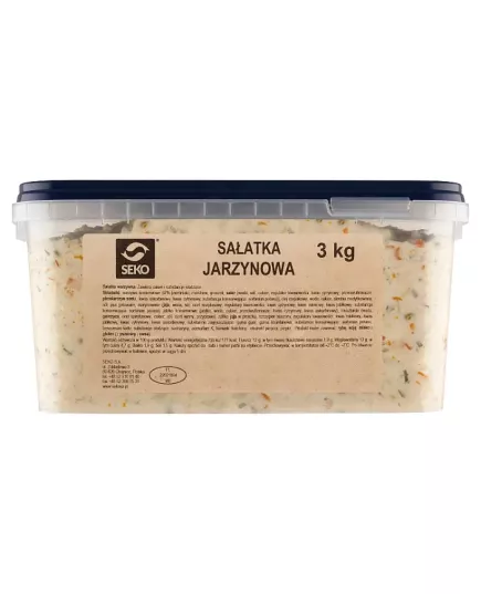 warzywa konserwowe 67 % [ziemniaki, marchew, groszek, SELER (woda, sól, cukier, regulator kwasowości: kwas cytrynowy, przeciwutleniacze: PIROSIARCZYN SODU, kwas askorbinowy, kwas cytrynowy; substancja konserwująca: sorbinian potasu)], olej rzepakowy, woda, cukier, skrobia modyfikowana, sól, jaja gotowane, marynowane (JAJA, woda, sól, ocet spirytusowy, regulatory kwasowości: kwas cytrynowy, kwas mlekowy, kwas jabłkowy; substancja: konserwująca sorbinian potasu), jabłko konserwowe (jabłko, woda, cukier, przeciwutleniacze: kwas cytrynowy, kwas askorbinowy), musztarda (woda, GORCZYCA, ocet spirytusowy, cukier, sól, ocet winny, przyprawy), żółtko JAJA w proszku, szczypior suszony, regulatory kwasowości: kwas mlekowy, kwas jabłkowy, kwas cytrynowy, kwas askorbinowy, substancje zagęszczające: guma guar, guma ksantanowa, substancje konserwujące: sorbinian potasu, benzoesan sodu, substancje słodzące: sacharyny, acesulfam K, barwnik: karoteny, ekstrakt pieprzu, pieprz